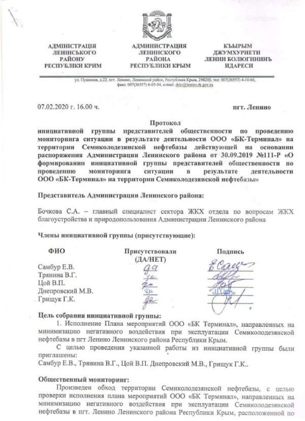 В ноябре 2019 года правительство Крыма приняло решение приостановить деятельность нефтебазы. Немного позже собственник предприятия разработал план мероприятий по устранению выявленных нарушений. В рамках реализации плана мероприятий, направленных на минимизацию негативного воздействия при эксплуатации нефтебазы, инициативная группа в составе общественников и представителей районной администрации неоднократно выходила на объект. Результаты работы комиссии направлялись главе региона Сергею Аксёнову для ознакомления.
