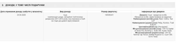 Тимошенко задекларировала, что 24 апреля 2020 года она получила эквивалент 148 345 441 гривен от компании Reid, Collins, Tsai LLP. Видом дохода указана – «компенсация ущерба, причиненного политическими репрессиями 2011-2014 годов, полученная в США на стадии досудебного урегулирования».