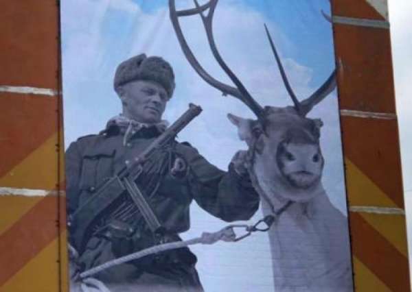 Так, на баннере изображен финский солдат Юни Клемет Халонен из Утсйоки в вермахтовском кителе. Снимок сделали в Лапландии в мае 1944 года. До сентября 1944 года Финляндия воевала на стороне гитлеровской Германии.