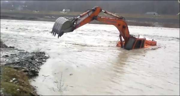 Водитель использовал огромный вес экскаватора и ковш, которым цеплялся за дно реки. В какие-то мгновения машина едва ли не наполовину погружалась под воду, но продолжала бороться с рекой. Спустя считанные минуты она выехала на берег. Невероятное зрелище!
