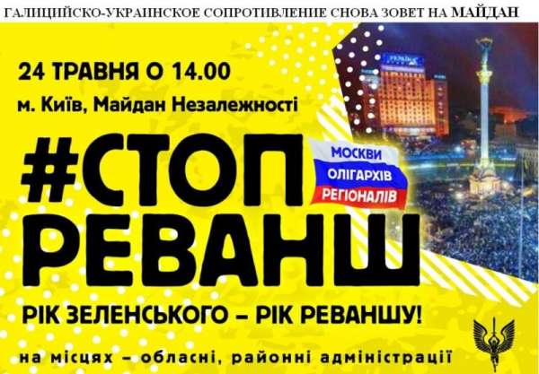 «20 мая – годовщина правления Зеленского и реванша Москвы – сказано в заявлении этого движения. – Год реванша Москвы в Украине это: 1. Капитулянтская политика перед российским агрессором. 2. Внешняя политика под диктовку Кремля... 5. Разрушение государственнической гуманитарной политики и новое наступление «русского мира» на украинский язык и культуру. 6. Портнов, Лукаш и другие не только вернулись в Украину, но и управляют судами и прокуратурой и открыто угрожают активистам. 7. «Беркут» на свободе, а украинские добровольцы-майдановцы в тюрьме. 8. Развертываются политические репрессии против украинских патриотов в стиле НКВД… 24 мая мы, ответственные украинские граждане, свободные люди, должны выйти и показать, что мы против произвола и лжи».