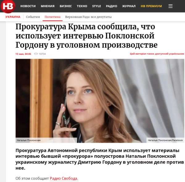 Другой радикальный майдановец Дмитрий Гордон пошёл ещё дальше – он взял интервью у депутата Госдумы РФ Натальи Поклонской, которую на Украине обвиняют в «действиях, предпринятых с целью насильственного изменения или свержения конституционного строя или захвата государственной власти». Интервью Гордон разместил на своём Ютуб-канале, где оно в короткое время набрало больше миллиона просмотров.