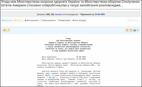 История сотрудничества Украины и США в области уничтожения оружия массового поражения, проходящая только на территории Украины, а не Америки, начинается в 1993 году с момента подписания договора о транспортировке ядерных боеголовок из Украины в Россию. Программа постепенно расширялась, в 2005 году Киев и Вашингтон подписали дополнительный договор №840_138 от 29.08.2005 – между Министерством здравоохранения Украины и Министерством обороны США о предотвращении распространения технологий, патогенов и знаний, которые могут использоваться в ходе разработки биологического оружия.