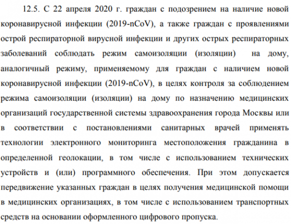 Согласно пункту № 12.5. Указа № 55-УМ одно лишь подозрение на наличие коронавирусной инфекции является основанием для того, чтобы принудить москвичей соблюдать двухнедельный режим самоизоляции, а для контроля за соблюдением этого режима предписано применять «технологии электронного мониторинга местоположения гражданина в определённой геолокации».