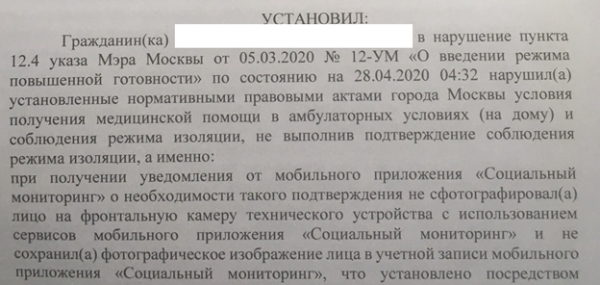Количество оштрафованных по тут же изобретённой для сидельцев домашних концлагерей статье 3.18.1 КоАП г. Москвы стремительно растёт. Кто-то из них разбирается в такого рода гаджетах чуть лучше, чем моя 72-летняя мама. Кто-то банально спал (многим уведомления программы «Социальный мониторинг» приходят среди ночи, когда они спят и не слышат телефон). Не отправил? Штраф! 4000 рублей.