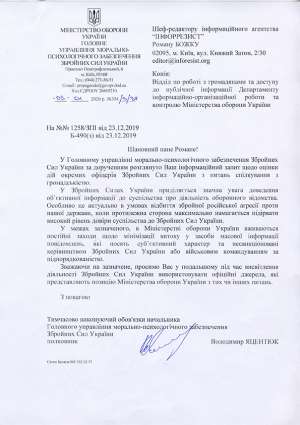 Учитывая вышесказанное, просим Вас в дальнейшем при освещении деятельности ВСУ использовать официальные источники, которые представляют позицию МОУ по этим или другим вопросам».