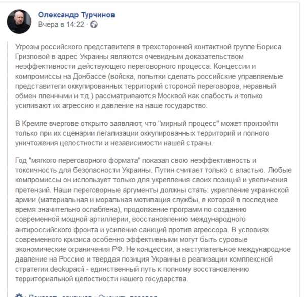 «Угрозы российского представителя в трехсторонней контактной группе Бориса Грызлова в адрес Украины являются очевидным доказательством неэффективности действующего переговорного процесса. Концессии и компромиссы на Донбассе (войска, попытки сделать российских представителей оккупированных территорий стороной переговоров, неравный обмен пленными и т.д.) рассматриваются Москвой как слабость и только усиливают их агрессию и давление на наше государство», - считает Турчинов.