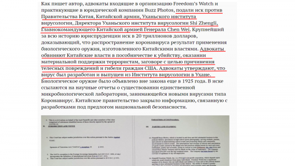 Процесс, который формально был начат еще в марте, сегодня не только набирает обороты, но и привлекает все большее число участников. Десятки стран (либо просто граждан из этих стран), число которых уже приближается к 60-ти, либо подали, либо готовы подать иски против Китая, обвиняя его в «преднамеренном заражении планеты с помощью «биологического оружия», либо в целенаправленном сокрытии информации об истинных масштабах эпидемии на начальном ее этапе».