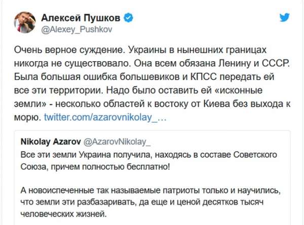 Украинского политика поддержал российский сенатор Алексей Пушков, подчеркнув, что в нынешних границах Украина никогда не существовала, а большевики совершили большую ошибку, передав эти земли Украине: