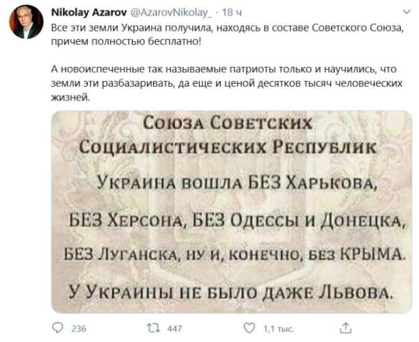 Как уточнил бывший глава украинского правительства в Twitter, Украина вошла в состав Советского Союза без Одессы, Харькова, Донецка, Херсона, Луганска, Крыма и даже Львова.