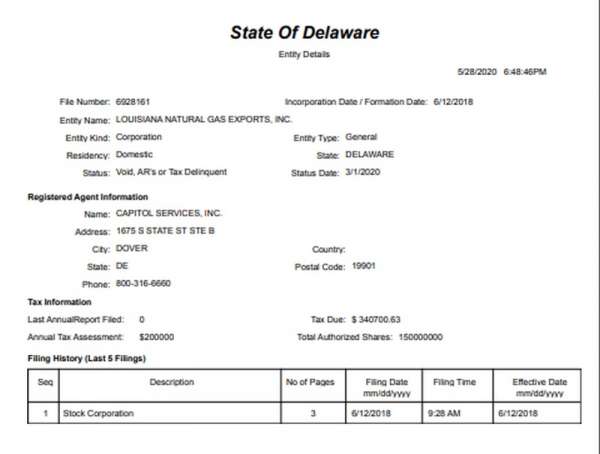 Как выяснили журналисты ZN.UA, подписавшую Меморандум со стороны США компанию Louisiana Natural Gas Exports даже в офшорном Делавере официально считают злостным неплательщиком налогов. Её налоговый долг на 1 марта 2020 превышал 340 тысяч долларов при ежегодном налоговом обязательстве в 200 тысяч, то есть налоги они не заплатили не потому, что были заняты подписанием Меморандума с Украиной.