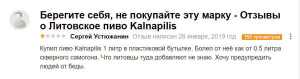 Живой пример тому литовское пиво. Оно настолько неприятно на вкус, что люди взяв его по акции в магазине, пишут негативные отзывы. Это настоящая низкосортная сивуха и суррогат.