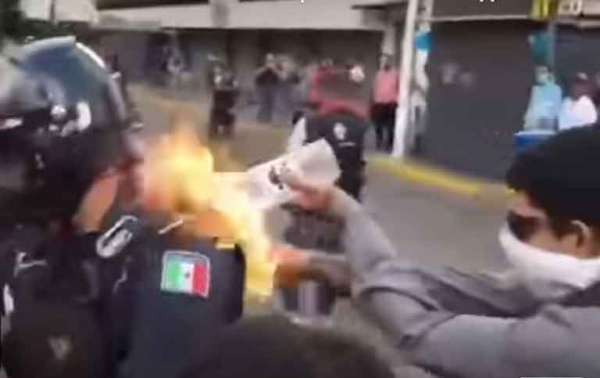 Во время попытки мирного урегулирования ситуации один из протестующих в маске облил горючей жидкостью со спины, садящегося на мотоцикл полицейского и поджог его. Пламя мгновенно охватило, как силовика, так и его транспортное средство. Толпа предприняла попытку оттеснить полицейских от горящего коллеги, но она не увенчалась успехом.