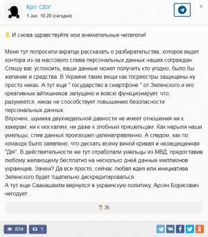 "... слив данных произошел целенаправленно. А следом, как по команде было заявлено, что дескать всему виной кривая и незащищенная "Дія". В действительности же тут отработали умельцы из МВД, предоставив любому желающему бесплатно на несколько дней данные миллионов украинцев. Зачем? Да все просто, сейчас любая идея или инициатива Зеленского будет тщательно дискредитироваться".