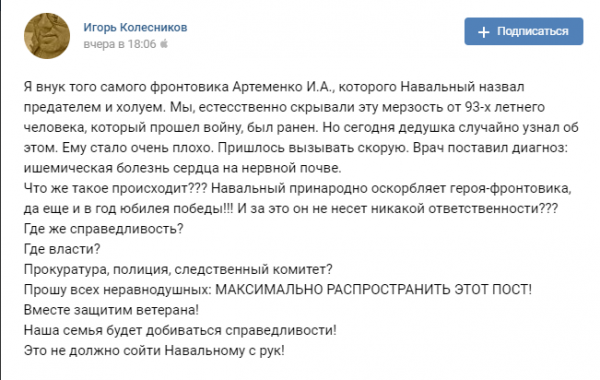 О печальном инциденте на своей странице в социальной сети рассказал внук оскорблённого Навальным героя войны Игорь Колесников, призвав правоохранителей сурово наказать блогера за отвратительное поведение и издевательства над ветераном ВОВ. Игорь признал, что родственники скрыли от дедушки новость о словоблудии либерального блогера. Но он всё же от кого-то услышал об оскорблениях и ему стало плохо. Пришлось вызывать скорую. Врач констатировал ишемическую болезнь сердца на нервной почве. Артеменко оказался на больничной койке.