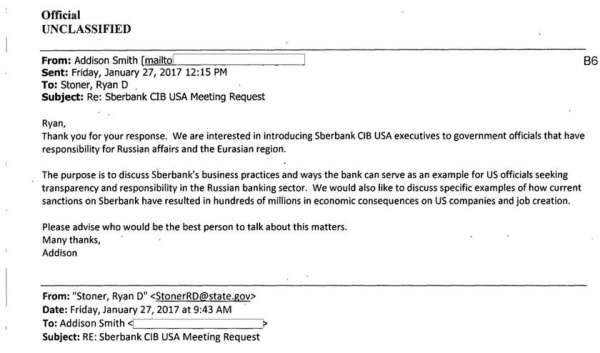 Примечательно, что в дальнейшем обсуждении Эддисон разъясняет, что "цель встречи — обсуждение бизнес-практики Сбербанка и способов, с помощью которых Сбербанк может служить примером для должностных лиц США, ищущих открытость и ответственность в российском банковском секторе". Таким образом, представители Сбербанка прямо заявляют о своей готовности и даже о желании обсуждать с сотрудниками Госдепартамента свои бизнес-практики и некие особенности российской банковской сферы. Чтобы не быть голословными, приведём и тут скриншот этого письма», — сообщает агентство Лайф Ньюс, в распоряжении которого оказалась официальная переписка Сбербанка и Госдепартамента, которую, впрочем, может получить любой желающий — никто секрета из этого делать не стал.
