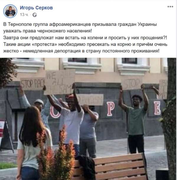 В Тернополе группа афроамериканцев призывала граждан Украины уважать права чернокожего населения. Об этом на своей странице в Facebook сообщил адвокат Игорь Серков.