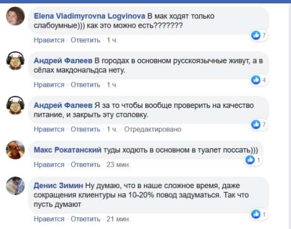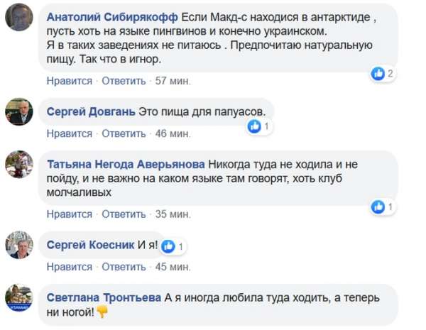 «МакДональдс оказался в эпицентре языкового скандала. Правда, на этот раз возмутились русскоязычные граждане Украины, что бывает редко. Но МакДональдс озвучил свою официальную позицию: русского языка в заведении не будет. Будут ли там русскоязычные посетители, каждый уже будет решать для себя», - написал блогер Денис Гороховский.
