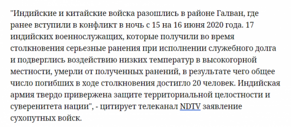 Посмотрим, как повлияет случившееся накануне на дальнейший ход переговоров между странами. Пока же Пекин направил Дели «решительный протест», а индийская сторона добавила к числу погибшим еще 17 бойцов.