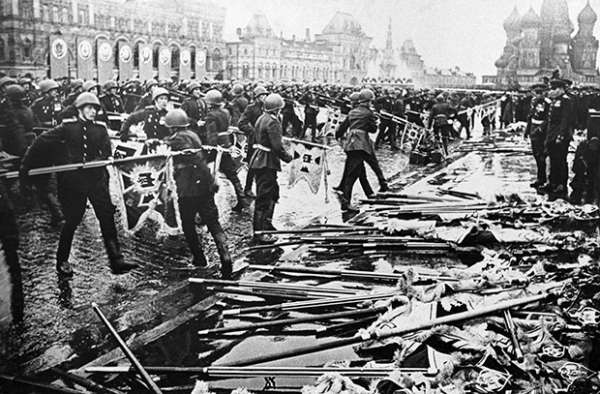 24 июня 1945 года на Красной площади прошел первый парад Советской Армии после победы над фашистами. Там присутствовал Сталин и Жуков. Солдаты-победители бросили знамена нацисткой Германии к подножию Мавзолея Ленина.