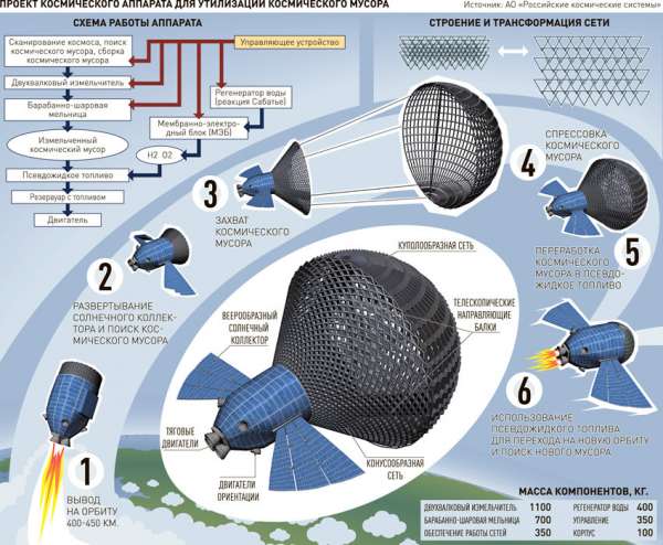 Инженеры из холдинга «Российские космические системы» (РКС) изобрели довольно необычный спутник-уборщик. Он должен захватывать на орбите вышедшие из строя спутники, чтобы «перемолоть» их в барабанно-шаровой мельнице до состояния мелкодисперсного порошка и переработать в топливо для собственных двигателей. Как пишет «Российская газета», это будет, по сути, автономный робот с бесконечной жизнью.
