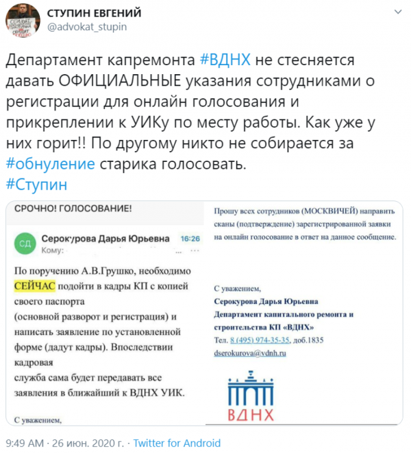 Не секрет, что столь масштабное мероприятие, как общенародное голосование вызвало у российской оппозиции дикое желание выставить себя дураками и наштамповать побольше вбросов. Ступин решил не отставать от коллег, заявив в своем Twitter-аккаунте, будто сотрудников департамента капремонта и строительства КП «ВДНХ» заставляют приносить копии паспортов в отдел кадров и заполнять соответствующую форму, которую позднее передадут в ближайшие избирательные участки. Сказать, что эта новость – полнейший бред, ничего не сказать.