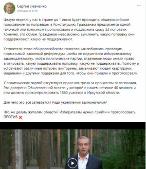 Больше всего печалит тот факт, что многие действительно убеждены, что для участия в викторинах и розыгрышах нужно прийти и проголосовать именно «За» поправки. Удивлю, но нет - в лотереях можно участвовать даже тогда, когда человек проголосовал «против». Подобной информацией, по всей вероятности, не обладает депутат КПРФ в Иркутской области Сергей Лёвченко , который разместил в «Вконтакте» пост с жёстким призывом пойти и проголосовать против поправок.
