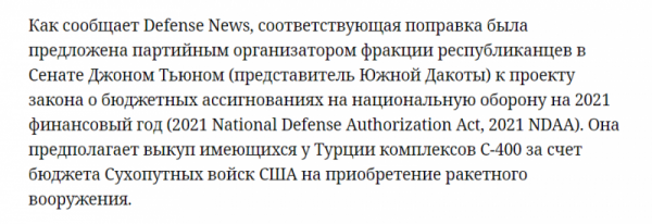 Вашингтон требовал отказаться от сделки с РФ и приобрести американские комплексы Patriot, но Анкара отказалась приобретать американскую систему «дырявый зонтик»: республика, с одной стороны, нуждалась в собственной системе ПВО, с другой — кроме защиты воздушно-космического пространства страны зенитно-ракетные системы С-400 оказались идеальным инструментом воздействия на Вашингтон.