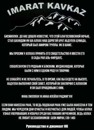 Соболезнование «Имарат Кавказ» в гибели Абдуллы Цумада