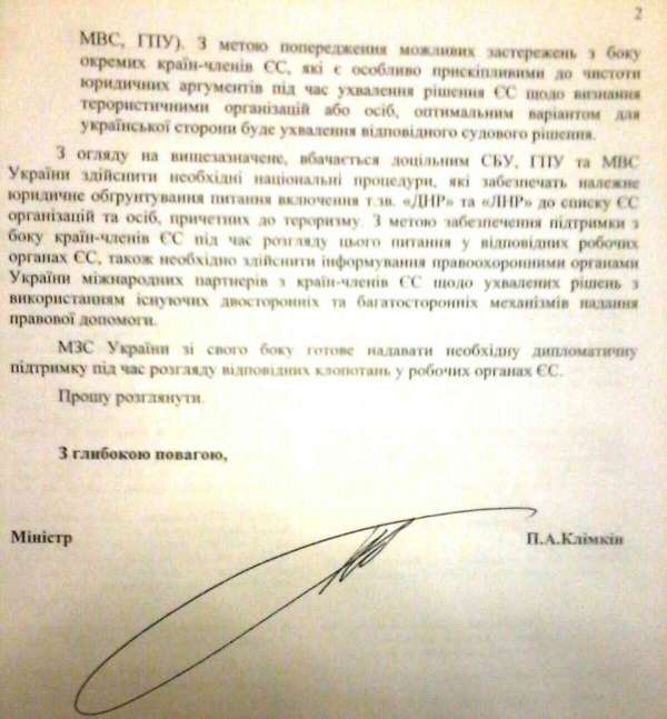 Министр иностранных дел Украины Климкин предлагает президенту Порошенко сосредоточить пропагандистские усилия всех возможных структур на создании в глазах зарубежной общественности образа ДНР и ЛНР как террористических организаций. С этой целью рекомендуется привлекать как можно больше лиц к уголовной ответственности по статьям, связанным именно с терроризмом.