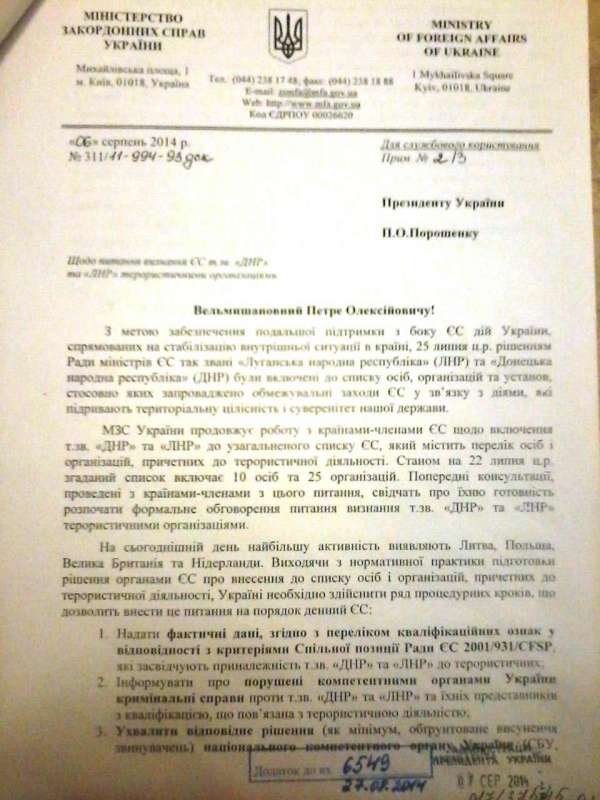 Письмо министра иностранных дел П. А. Климкина президенту П. А. Порошенко от 6 августа 2014 г., гриф — «для служебного пользования».