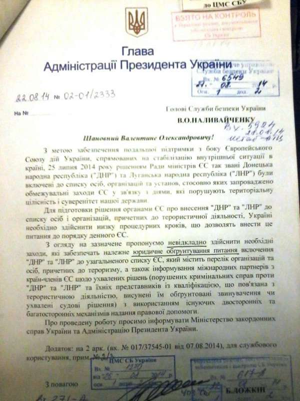 В дальнейшем глава президентской администрации Борис Ложкин направил руководителю СБУ Валентину Наливайченко указания «немедленно предпринять необходимые меры, которые обеспечат необходимое юридическое обоснование вопроса включения» ДНР и ЛНР в список террористических организаций ЕС.