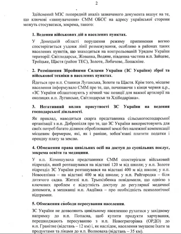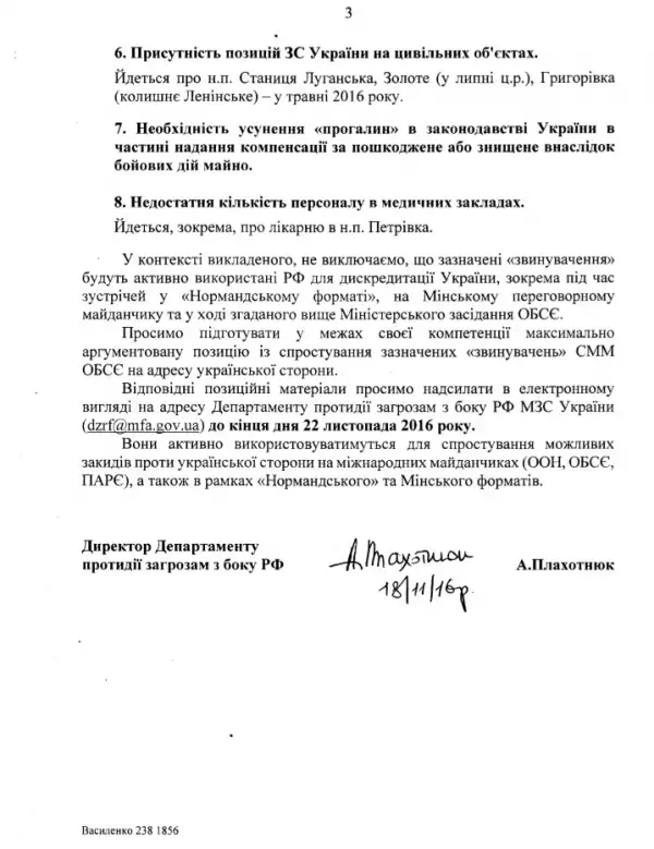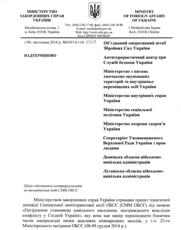 Как явствует из закрытого документа, все тот же МИД обращается к государственным структурам Украины с просьбой придумать контраргументы, опровергающие обвинения, которые обоснованно готовит выдвинуть против Украины миссия ОБСЕ по результатам работы в районе проведения «антитеррористической операций (АТО)». При этом украинские дипломаты, перечисляя в своем письме реальные факты, умышленно берут слово «обвинения» в кавычки, демонстрируя тем самым свое пренебрежение к позиции ОБСЕ.