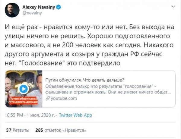 Вчера завершилось всероссийского голосование по конституционным поправкам. Навальный заявил, что не признает его итогов и призвал россиян выходить на митинги, чтобы «свергнуть власть». В общем, ничего нового он не предложил, но к очередному нарушению закона товарищ крайне близок.
