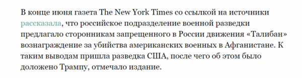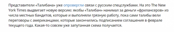 Несмотря на то, что Пентагон не подтверждает противоправных действий России в отношении американских военных в Афганистане, демократы своих подозрений не снимают. От бессилия досрочно отлучить нынешнего хозяина белого дома от власти они продолжают тиражировать «предательство Трампом» американских военных в Афганистане — логическое продолжение вмешательства русских в президентские выборы 2016 года. Это значит, что читателям The New York Times еще предложат отведать порцию развесистой клюквы под названием «боевики на фрилансе», ведь под соусом из махровой русофобии гораздо сподручней и дальше дискредитировать президента.