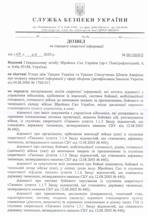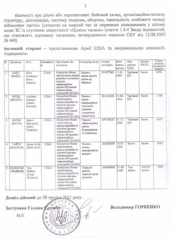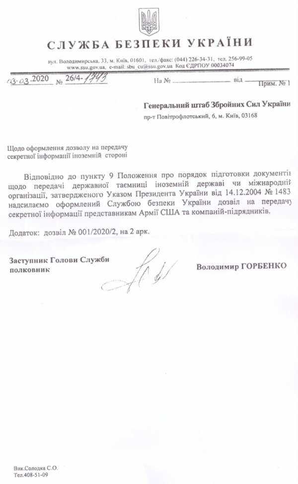 В сопроводительном письме в Генштаб ВСУ, замначальника СБУ полковник Владимир Горбенко пояснил, что речь идет именно о «разрешении на передачу секретной информации представителям армии США и компаний-подрядчиков». Допуск американским представителям оформлен СБУ сроком до 30 декабря 2021 года на основании соглашения между правительствами Украины и США об охране секретной информации в сфере обороны, — пишет «АСД».