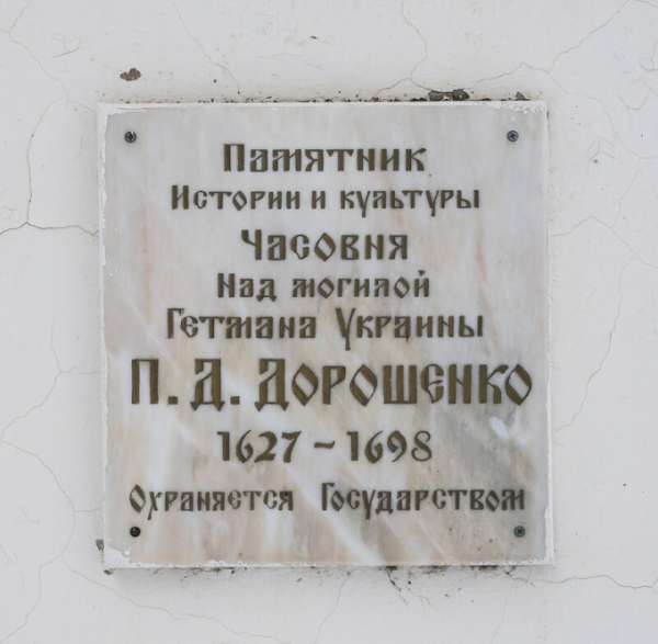 Но, вы не поверите, точно так же не желают украинские власти чествовать и единственную достоверно известную и доказанную могилу украинского гетмана Петра Дорошенко, кстати, родственника Хмельницкого и его сподвижника по национально-освободительной борьбе, женатого на Любови Павловне Яненко, дочери племянника великого гетмана.