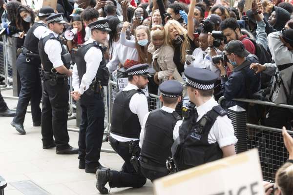 Полиция становится на колени перед протестующими, они того требуют. Фото: Ray Tang/Keystone Press Agency/Global Look Press.