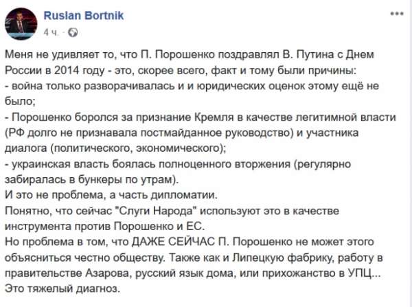 «Но проблема в том, что даже сейчас Порошенко не может это объяснить честно обществу. Также как и Липецкую фабрику, работу в правительстве Азарова, русский язык дома, или прихожанство в УПЦ… Это тяжелый диагноз», — резюмировал Бортник.