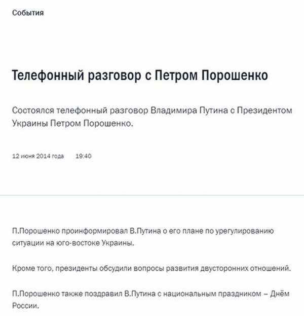 Отметим, 12 июня 2014 года на сайте Кремля сообщалось, что по инициативе украинской стороны состоялся телефонный звонок между Владимиром Путиным и Петром Порошенко, в ходе которого новоявленный президент Украины поздравил главу РФ с Днём Республики.