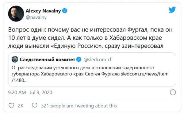 Твит странный даже для Навального. Учитывая, как давно он и сам находится в политике, непонятно, отчего блогера так удивляют сроки на согласование всех процедур. В том числе, и на задержание. Надо понимать, что Фургала обвиняют не в растрате госбюджета, не в злоупотреблении должностными полномочиями, не в других, на фоне реального, детских преступлениях. Это, чёрт возьми, дело об убийстве, где фигурантом является губернатор!